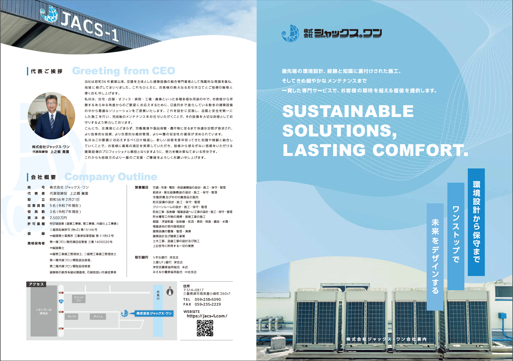 三重県津市に拠点を置く環境・空調専門サービスの株式会社 ジャックス・ワン様のコーポレートサイト制作の後、ホームページとマナー&テイストを合わせた会社案内パンフレットの制作をご依頼いただきました。